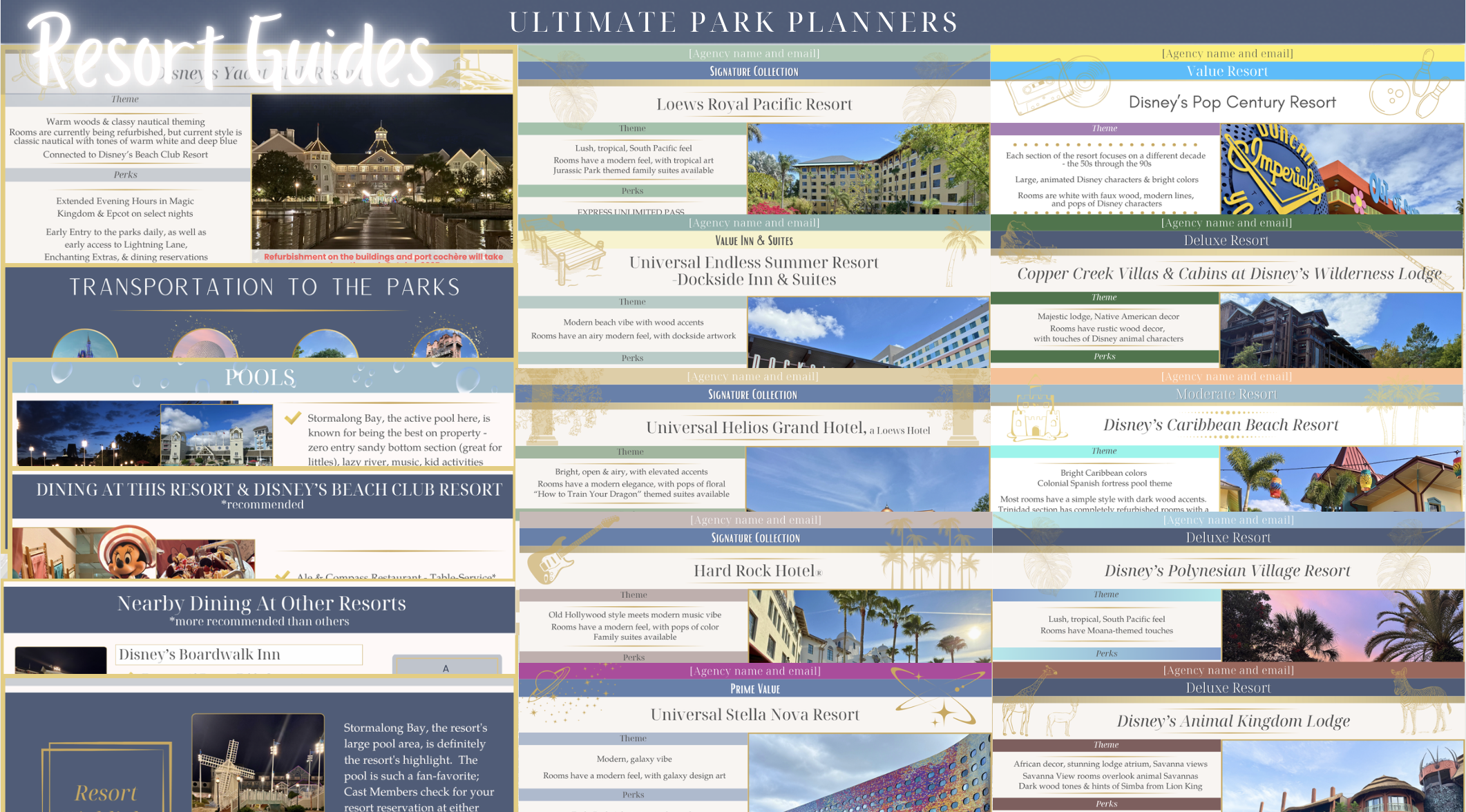 Proposing and explaining all the factors encompassing a well-planned Walt Disney World Resort vacation can be overwhelming— and just as challenging for clients to absorb. Our guides, designed as easy-to-customize Canva templates, are based on years of experience helping hundreds of families, couples, and friend groups return from this destination thrilled with their trip. We know the questions clients ask, the common points of confusion, and how to deliver the information in a way that’s clear and easy to understand.