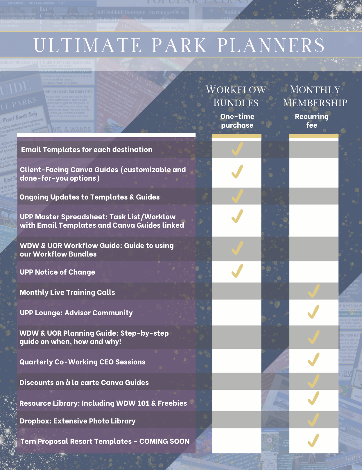 We know our members have questions as they work with their clients, so we have created a community within our Monthly Membership of Ultimate Park Planners to ask and answer questions. We also welcome feedback and suggestions for what you'd love to see added in the future! As the parks evolve, so does UPP. Since we visit the parks frequently and stay up to date firsthand, our members are always among the first to know the latest details inside the community.